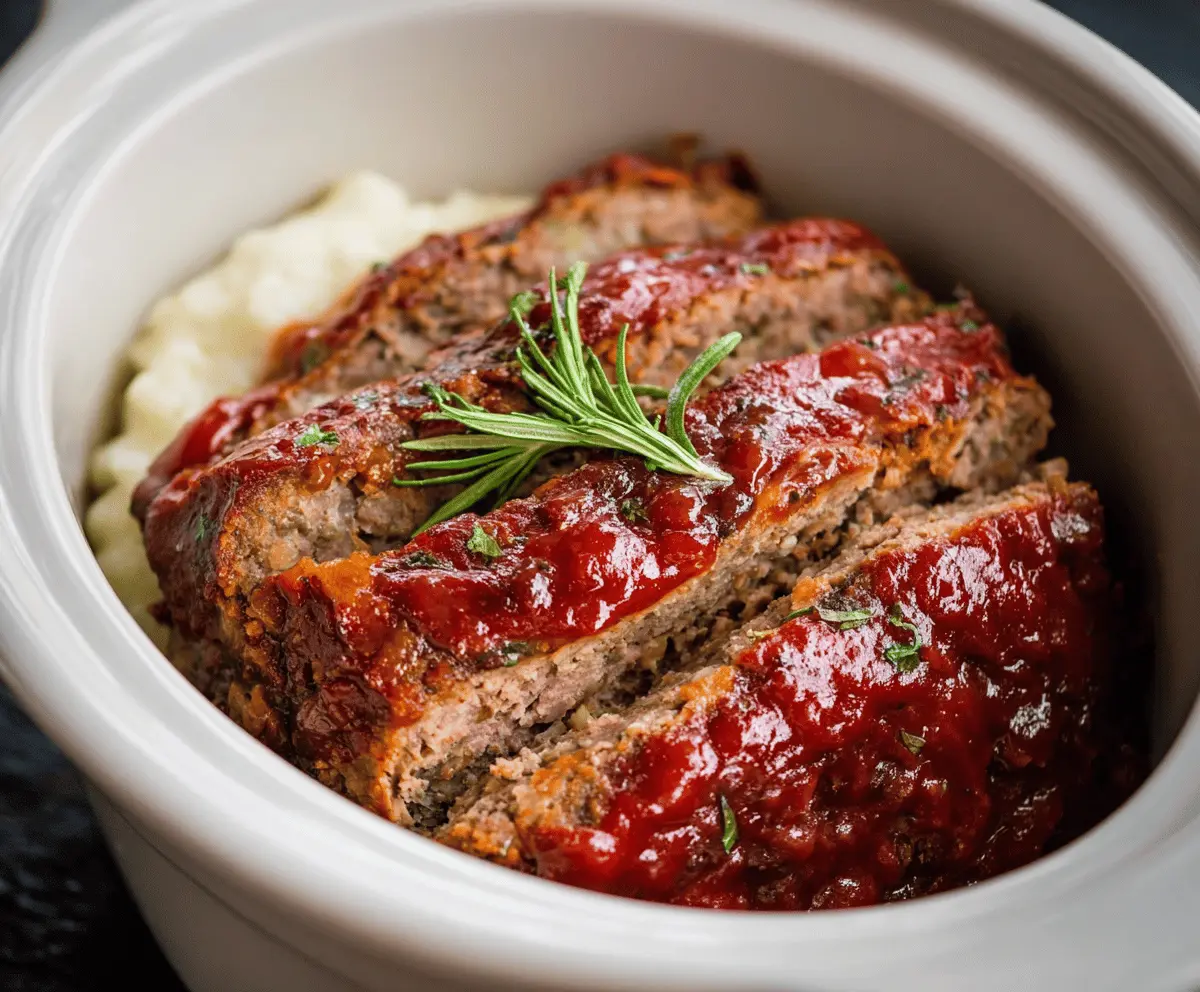 Once cooked, carefully remove the meatloaf from the slow cooker and let it rest for about 5-10 minutes before slicing. This will help the juices settle for a juicier slice!