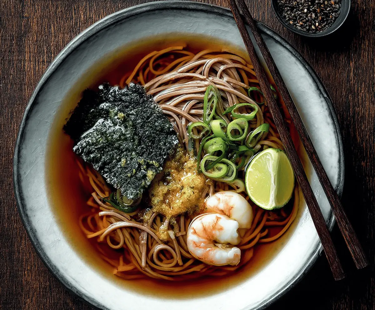 To serve, divide the cooked soba noodles among bowls. Carefully pour the hot broth over the noodles, making sure they’re nicely submerged in the savory liquid.