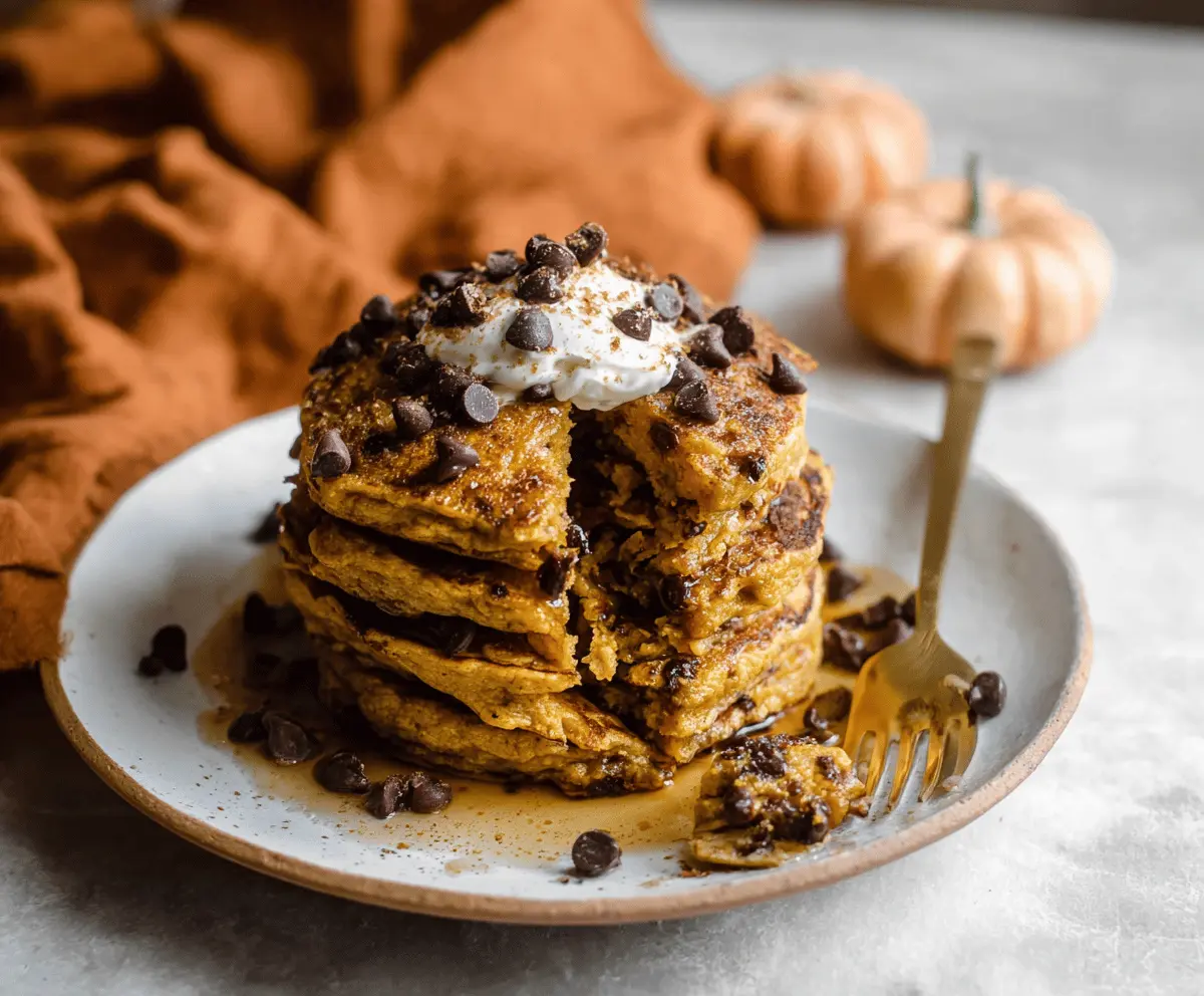 These pancakes are fluffy, full of cozy pumpkin spices, and balanced perfectly by gooey chocolate chips—perfect for a festive breakfast or brunch! Enjoy every bite!