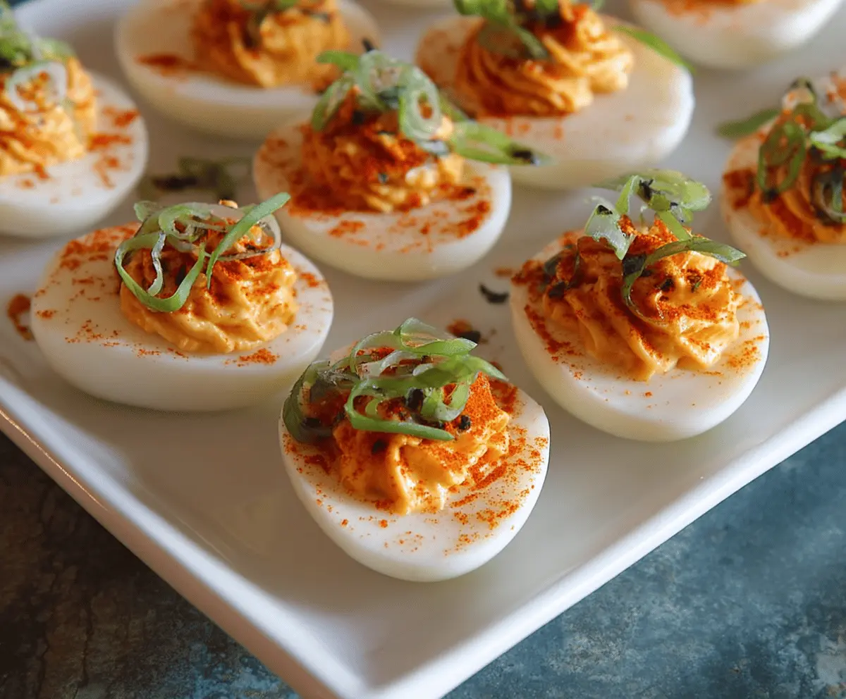 These Spicy Sriracha Deviled Eggs are a fun twist on a classic! Creamy yolks mix with zesty Sriracha to give them a nice kick. Perfect for parties or a tasty snack!