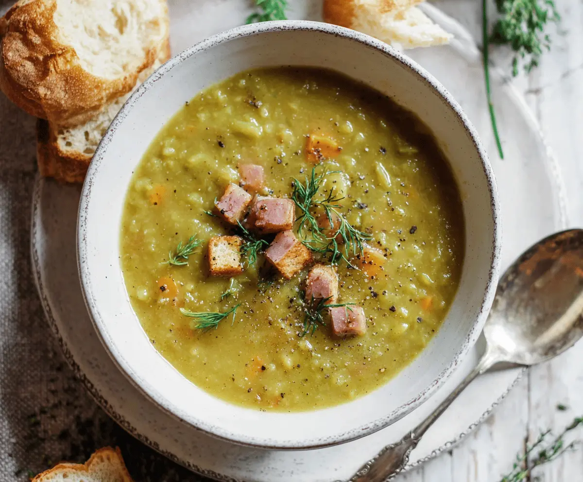 Split pea soup is a warm and comforting dish made with split peas, carrots, and onions. This simple recipe is perfect for chilly days, bringing smiles with every spoonful!