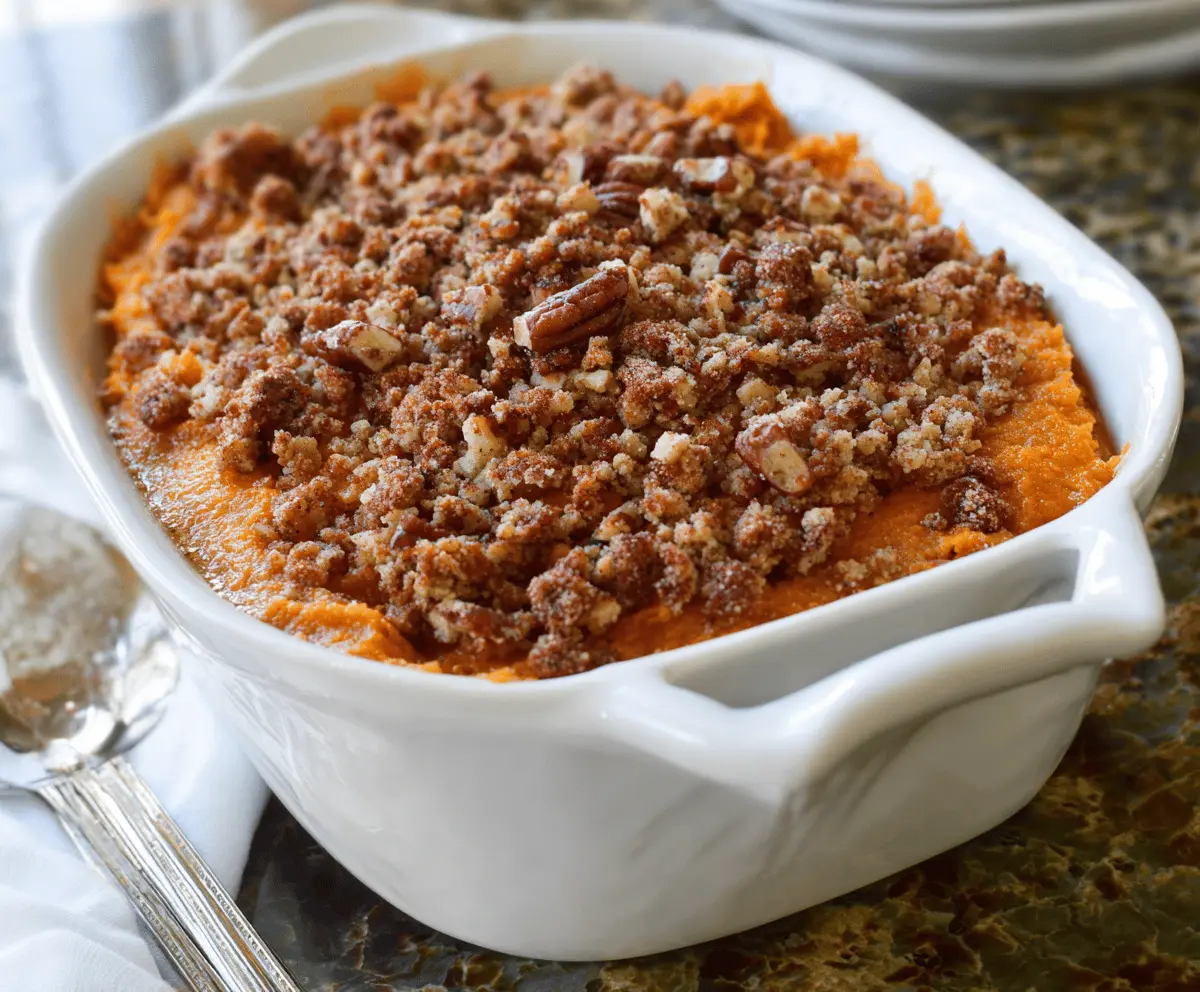 This sweet potato casserole is a warm hug on a plate! Creamy sweet potatoes topped with a crunchy pecan streusel make it a perfect side dish for any meal.