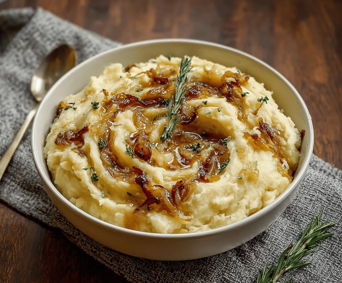 Transfer your creamy mashed potatoes to a serving bowl, and top them with the remaining caramelized onions. If you like, sprinkle some fresh thyme leaves on top for extra flavor and color!