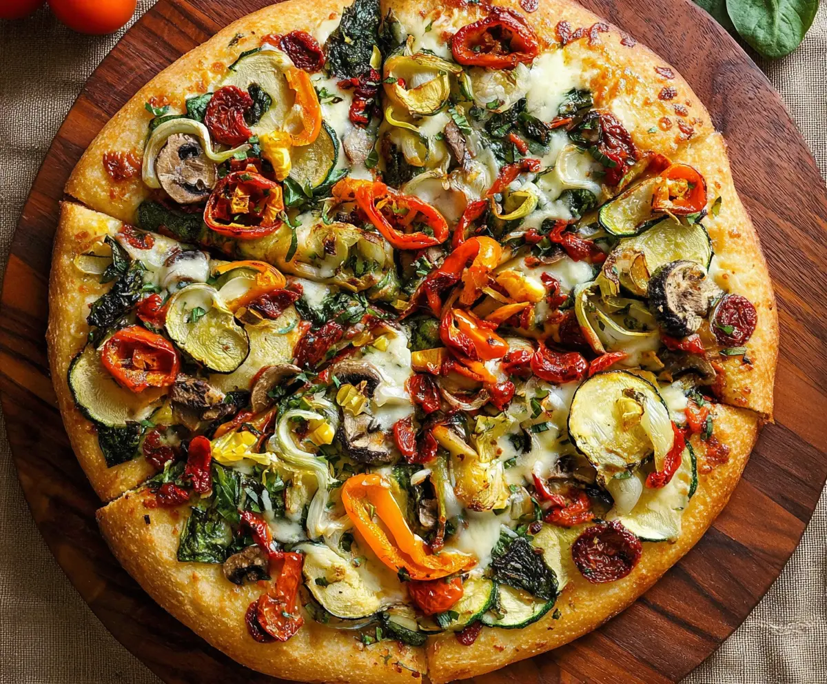 This veggie pizza is packed with colorful fresh vegetables like bell peppers, olives, and spinach, all tucked onto a hot, crispy crust. It’s tasty and makes for a fun meal!