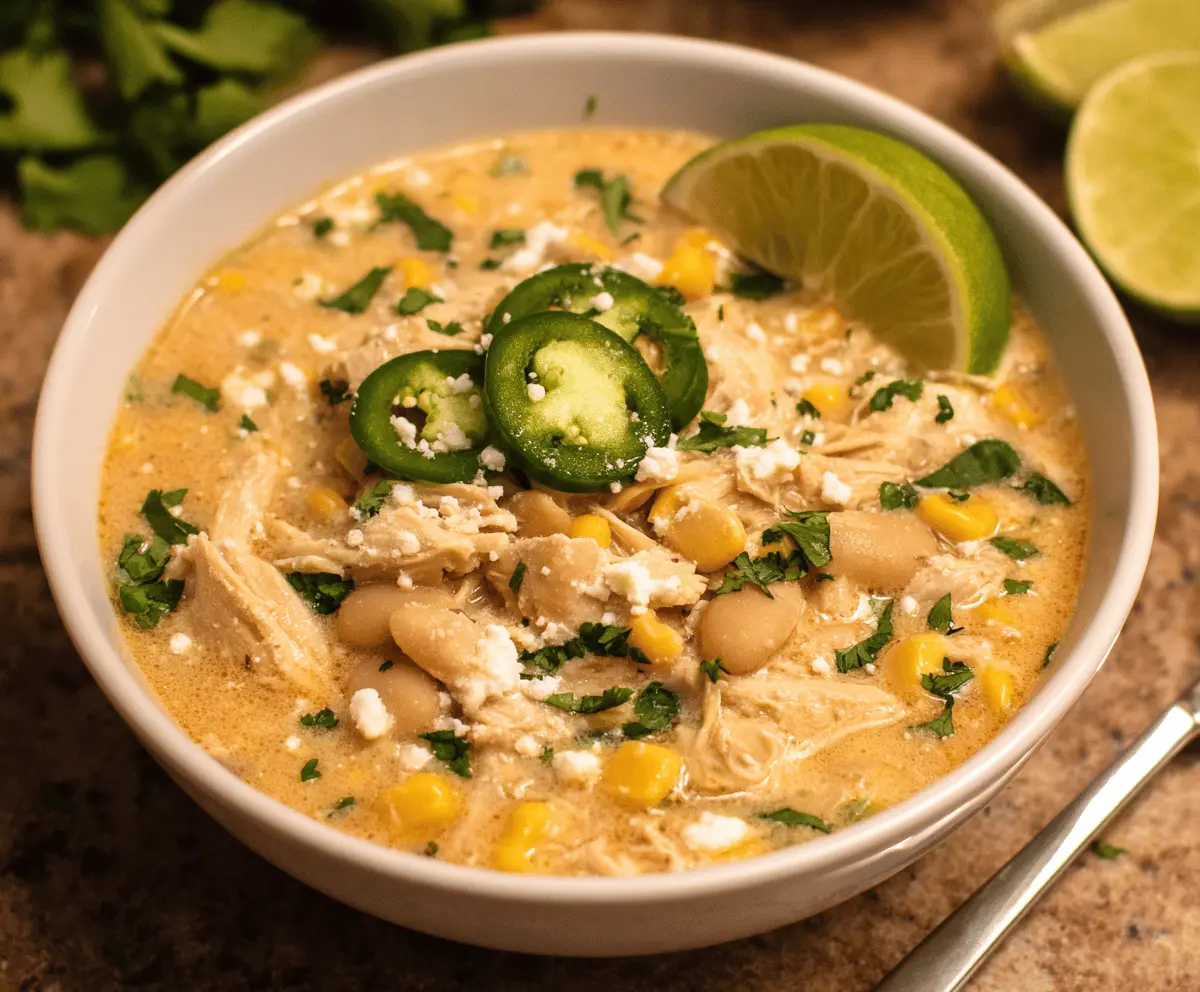 This warm and cozy white chicken chili is filled with tender chicken, creamy white beans, and tasty spices. It’s like a hug in a bowl!
